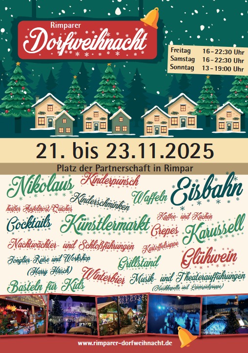 Zahlreiche Vereine, Abteilungen und Rimparer Institutionen arbeiten seit Wochen gemeinsam darauf hin und freuen sich, Sie vom 21.-23. November auf dem Platz der Partnerschaft zur diesjährigen Dorfweihnacht begrüßen zu dürfen. [...]