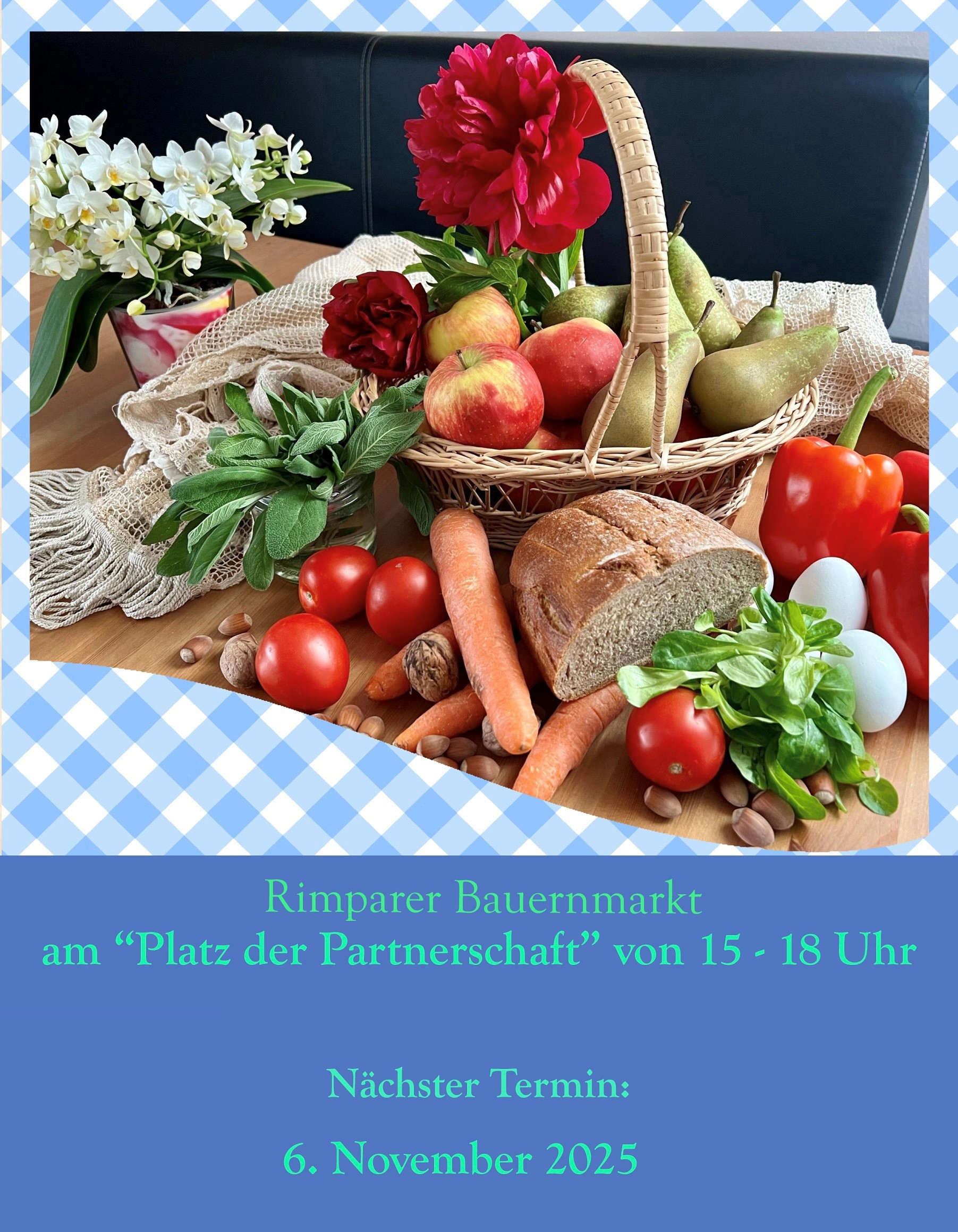Der nächste Rimparer Bauernmarkt findet am Donnerstag, 6.11.25, von 15 – 18 Uhr am „Platz der Partnerschaft“ statt.