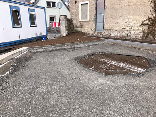 Bei den Aushubarbeiten zur Herstellung des tragfähigen Unterbaus wurde festgestellt, dass der vorhandene Untergrund nicht ausreichend tragfähig ist. Deswegen muss ca. 30cm tiefer „ausgekoffert“, ein Filtervlies verlegt und eine Bodenverbesserung aus Grobschotter hergestellt werden.